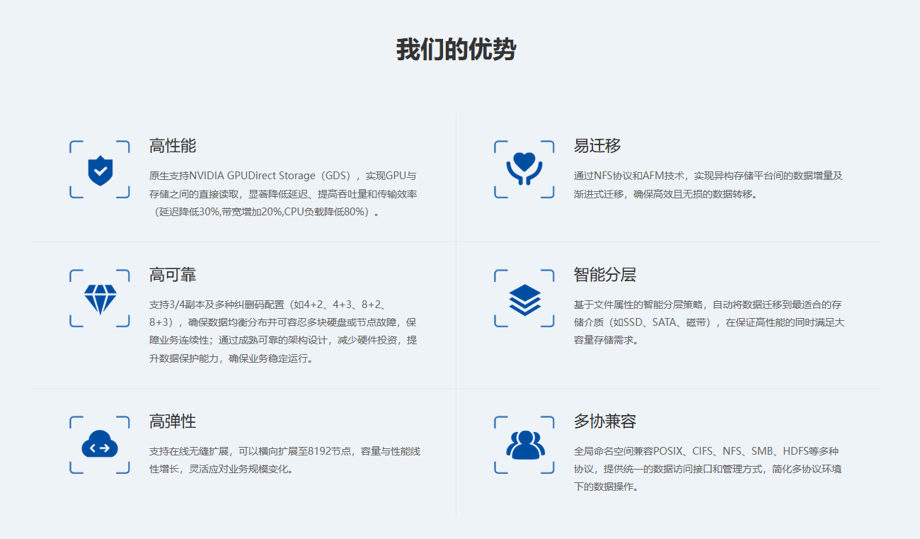 高性能分布式存儲解決方案滿足大模型訓(xùn)推場景和高性能計算場景對存儲的高性能、高可靠、高彈性、易遷移、智能分層及多協(xié)兼容的需求。